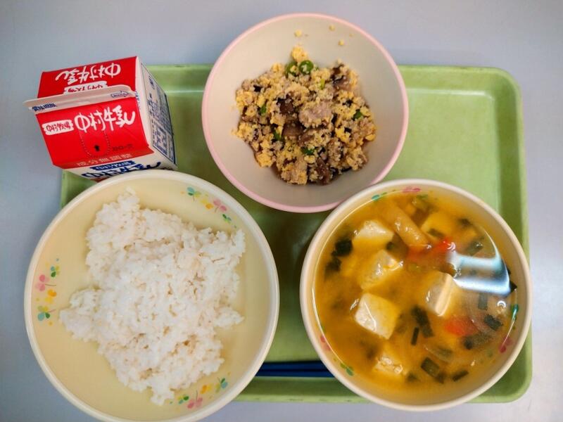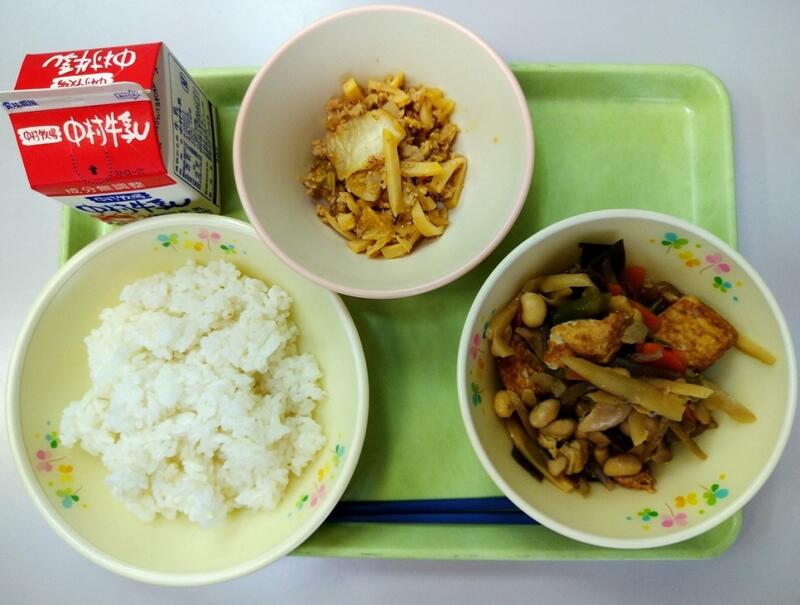 「今日は、「大豆」のお話です。大豆には体をつくる栄養素であるたんぱく質が豊富に含まれています。他にも私達の体ではつくられない必須アミノ酸という物質がバランスよく含まれているので苦手な人もいるかもしれませんがしっかりと食べるようにしましょう。また、今日は「キムタクご飯の具」を出しているので具とご飯を一緒に食べるようにしましょう。」