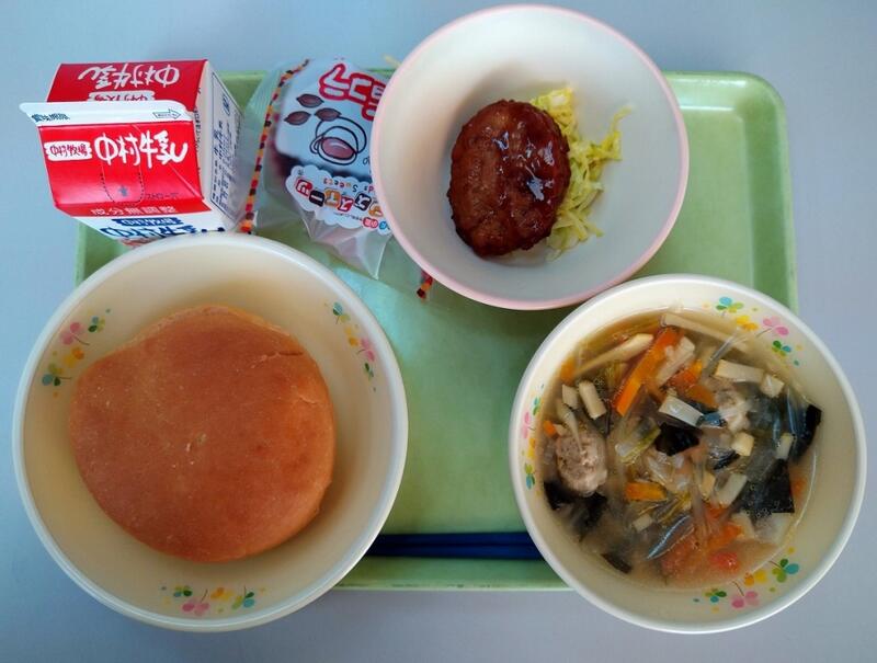 「今日の給食は、内野々分校のリクエスト給食です。ハンバーグに肉団子スープの組み合わせです。バーガーパンにハンバーグとキャベツを挟んで一緒に食べてください。その時にしっかりと洗った手でないと、パンと一緒にバイ菌も体の中に入ってしまい体調を崩してしまいます。給食前は特に手洗いをしましょう。」