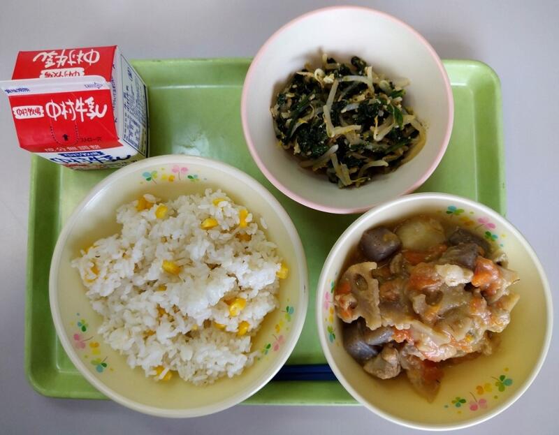 「コーンが日本に伝わってきたのは、16世紀ごろ、ポルトガル人によって長崎に伝えられたといわれています。食用のスイートコーン種はみずみずしく甘みが強いタイプです。栄養価が高く、主食の代わりにもなるためとうもろこしは、米、麦に並ぶ世界三大穀物の一つです。今日の給食ではコーンクリームシチューにたっぷり使っていますよ。」