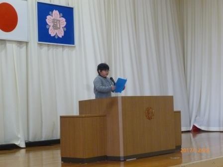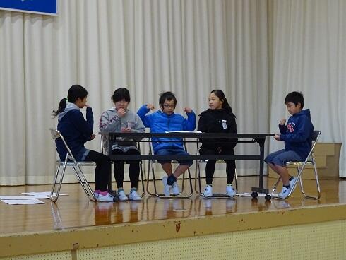 その後、5年生の代表児童2名による作文発表がありました。3学期に頑張りたいことを、理由や具体的な取組などを交えながら、分かりやすく発表してくれました。