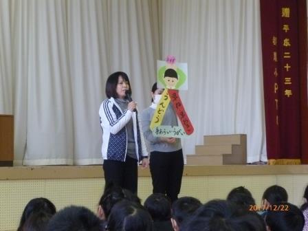各担当の先生からは、生徒指導面、学習面、健康保健面での冬休みの過ごし方についての話がありました。楽しい冬休みを過ごすために、それぞれの話を集中して聞く子どもたちでした。