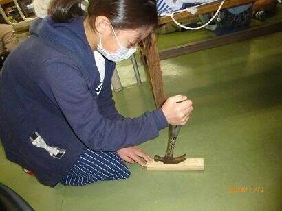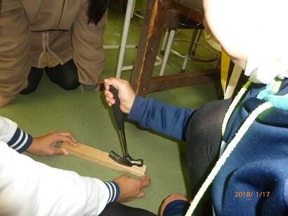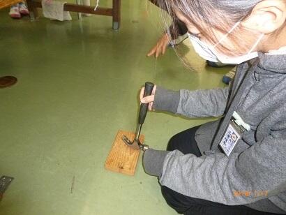 最初は、くぎを抜くのに悪戦苦闘していた子ども達でしたが、次第に、写真のように、楽に抜く方法を見付ける子どもが現れてきました。
