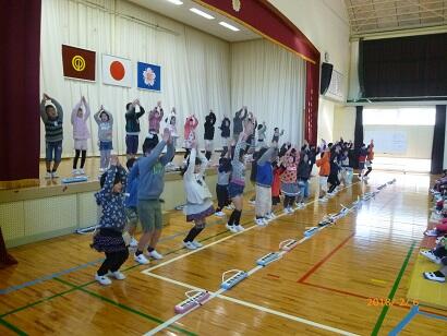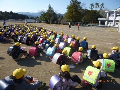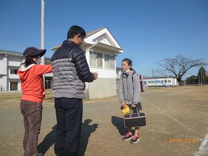 2月21日(水)、今日の全校集団下校は、運動場の状態が悪かったので体育館で行いました。今週のあいさつ名人です。