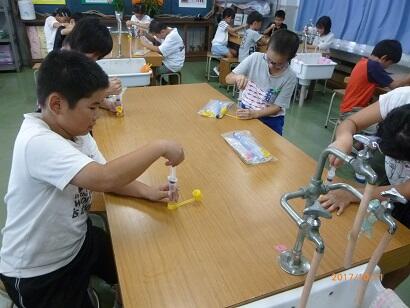 この単元では、「空気は( )だが、水は( )」という性質を実験をとおしてまとめていきます。