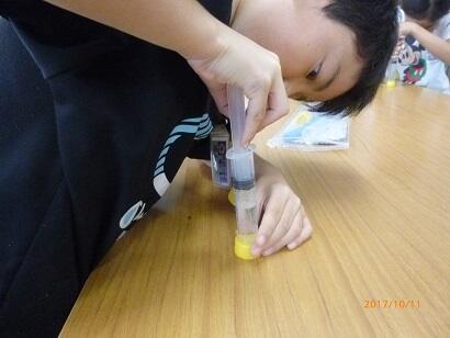 空気は力を入れて押すと体積が小さくなり、力を抜くともとの体積に戻ることを実験をとおして理解することができました。