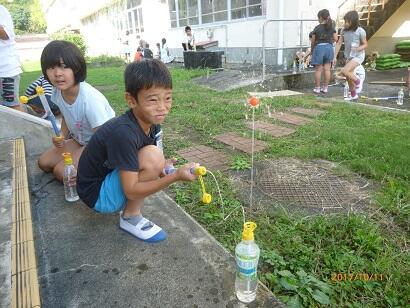 子ども達はさらに盛り上がりました。いろいろ工夫しながら何とか遠くまで飛ばす方法を考えていました。