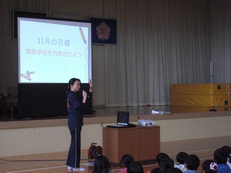 次に、今月の月目標の「家庭学習を充実させよう」について、担当の先生からお話がありました。家庭学習ですること【読み声 宿題 自学 読書 時間割】の確認や、先日まで児童玄関や各学級の廊下に展示してあった自学を参考にしながら、自学の進め方についてのお話がありました。