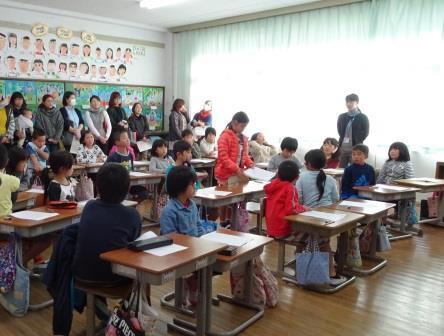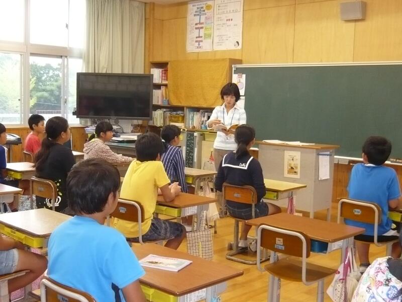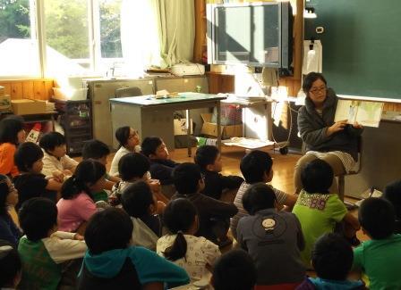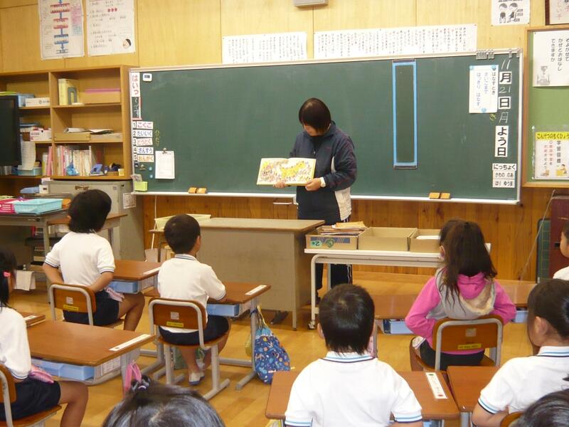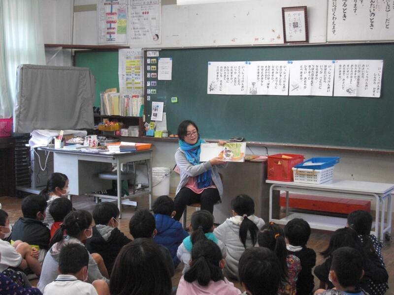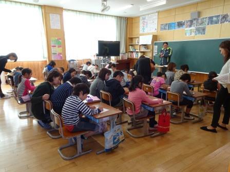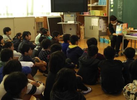 4年生はみんな、どのお話にも食い入るように見入っていました。最後の絵本が英語版の「大きなかぶ」だったので、日本語との違いを面白そうに見て、聞いていました。読み終わった後に「英語でねずみの鳴き声は?」とクイズを出されたときもたくさんの子が答え、とても盛り上がっていました。