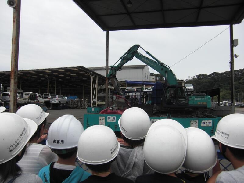 「久保田オートパーツ」では、自動車を様々なパーツに解体し、それを再利用するという仕組みを見学することができました。大きな重機を使い、自動車をアルミや銅などの素材に分別する工程では、とても迫力があり、子どもたちも興味津々でした。