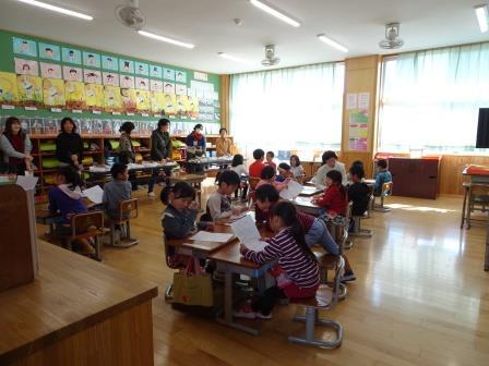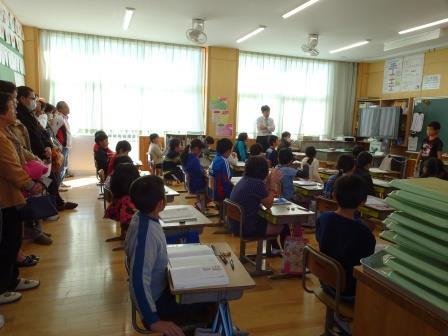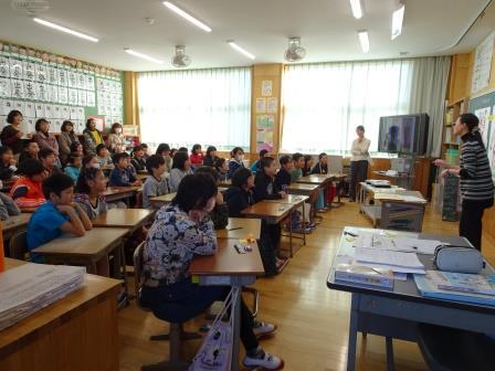 お話広場がありました。3年2組の教室では、なんと英語での読み聞かせが行われていました。今回読んでいただいたお話は、「おおきなかぶ」。子どもたちもよく知っている内容です。おじいさんやおばあさん、犬たちがかぶを一生懸命引っ張るときのかけ声や動物たちの鳴き声が英語と日本語では異なり、日本語の時とは違う表現やリズムを感じることができました。また、英語の文を日本語で訳していただいたり、英語の言葉の意味を教えてもらったりしながらの読み聞かせであったため、子どもたちは英語に興味をもち、楽しみながら読み聞かせを聞くことができました。