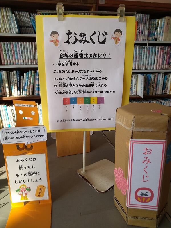 先週木曜日、図書室へ行ってみると、おみくじを発見しました。聞くと、毎週木曜に来校されている図書サポートの方が、本や新聞に親しんでほしいという願いを込めて作成していただいたとのこと。私もひいてみると、「吉;新聞に親しんでみるとよいでしょう」とくじに書いてありました。1月いっぱいまで置いてあるらしいので、ぜひ一度試してみたらどうですか?