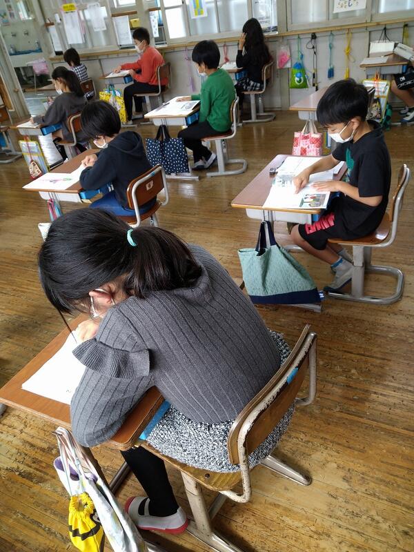 今週金曜は参観日の予定でしたが、感染症状況を踏まえ、止む無く中止といたしました。そこで本ページでは、各クラスの授業風景を紹介していきたいと思います。1回目は5年2組です。国語の「この本をおすすめします」。下級生が「面白い」「読んでみたい」と思うような本の紹介文を書いていました。辞書を引いて対象学年で習っている漢字がどうか確認しながら工夫しながら文を書き進めていました。