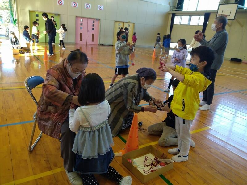 昨日、更生保護司の方々と2年生が「昔の遊び」で交流しました。都農町立小学校は先月、九州地方更生保護委員会委員長の民間協力者表彰を受けました。これは長年にわたり七夕交流事業を中心に保護司の方々と交流を通して、温かい社会づくりを続けてきたことによるものです。そこで、その披露の場をつくりたいということもあって、今回の交流となりました。急なお願いにもかかわらず、11名の方に協力いただき、メンコ・おはじき・ゴム跳び・けんだま・おてだま・紙風船・あやとり・ダルマ落としといった遊びを、教えていただきました。2年生は七夕飾りで一度交流していたこともあり、初めから笑顔満開。あっという間の45分で、口々に「まだ(た)やりたい」と…。心がホッとするひとときでした。