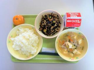 キムチ汁は、子どもの好きな給食のメニューとしてよくあげられるものです。ひじきの炒め煮は、ひじきの他に豆類や人参も入っており、味はもちろんのこと目(視覚)でも楽しめました。