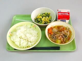 今日から中学1年生の給食がスタートしました。給食自体は共同調理場でつくっているので、小学校と中学校は同じものを食べています。しかし、小学校と中学校では量が違いますよ。