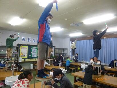 「ミョウバンは、温度を上げるとたくさん溶けるが、食塩はあまりとけない」ということに5年生はビックリしていました。