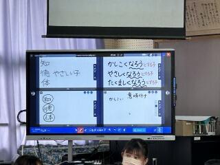 子どもが書き込んだ内容は、前方にある電子黒板に映し出されます。先生は、電子黒板を見て間違いがあればその部分を別途説明し、全体指導を行います。