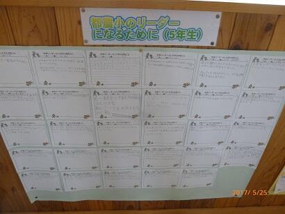 そこで、第1回のリーダー会で今年1年の「リーダーとしての目標」を書かせました。現在、児童玄関から入ったところに掲示しています。子どもたちには、いつもこの目標を意識し、リーダーとしての行動を振り返って欲しいと思っています。
