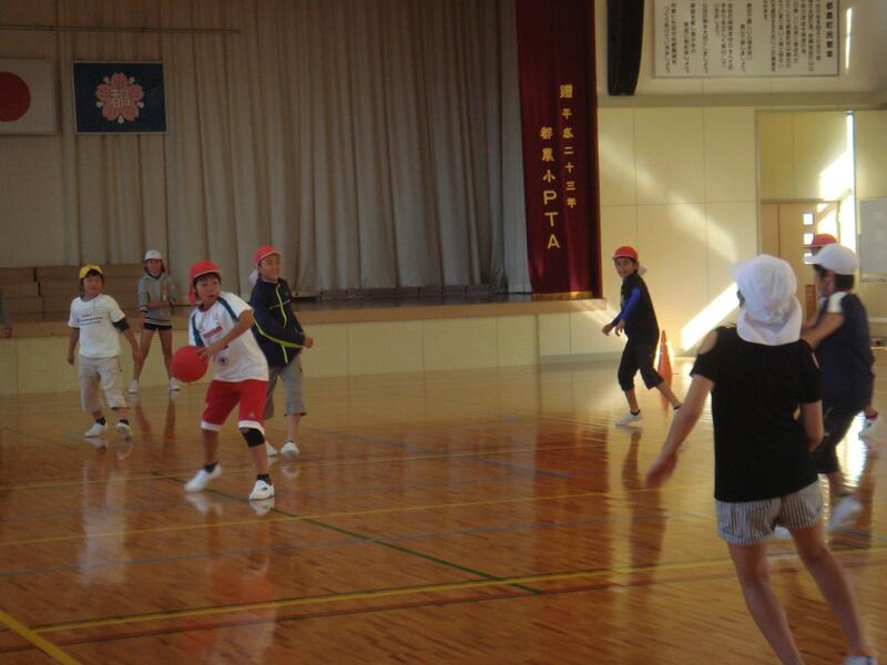 6年生は「先生たちに勝つ!」とやる気満々でした。参加できる職員が少なかったので、何人かの5年生が職員チームに入ってくれました。背の高い男の先生が上から投げるボールは位置エネルギーが加わってすごいパワーでした。6年生の強いボールを受け止め続ける女の先生もいました。チャレンジャーチームの試合の頃には、全学年から1人ずつは先生が集まり、ステージに座る子どもたちの応援も盛り上がっていきました。