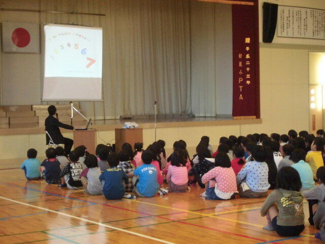 「幸せになる方法」と「脳に良いこと」について3つの要点を端的に示され、それぞれについて詳しく、いくつも例を挙げながら説明してくださったので、参加した3年生以上の子どもたちも楽しそうに、集中して聞き、よく理解できたようでした。