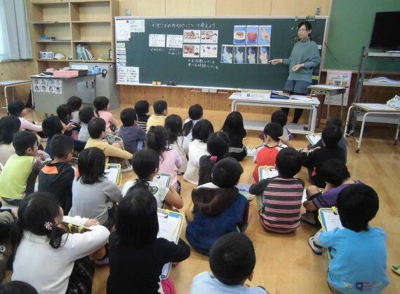 学級活動の時間に、共同調理場の栄養教諭の宮原先生に食に関する授業をしていただきました。「かむことの大切さについて考えよう」というめあてで学習を行いました。まず、2000年前から現代に至るまでの食べ物の変化と、かむ回数、時間との関係をイラストと数字から考えました。次に、食べ物の違いでどれだけかむ回数が変わるのかを調べるために、するめとゼリーを食べて、かむ回数を数え比べました。子どもたちはかむことを意識しながら、真剣な表情で回数を数えていました。