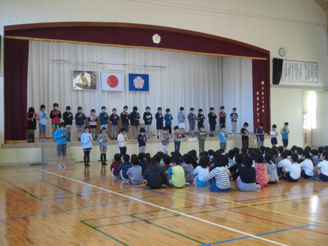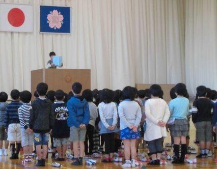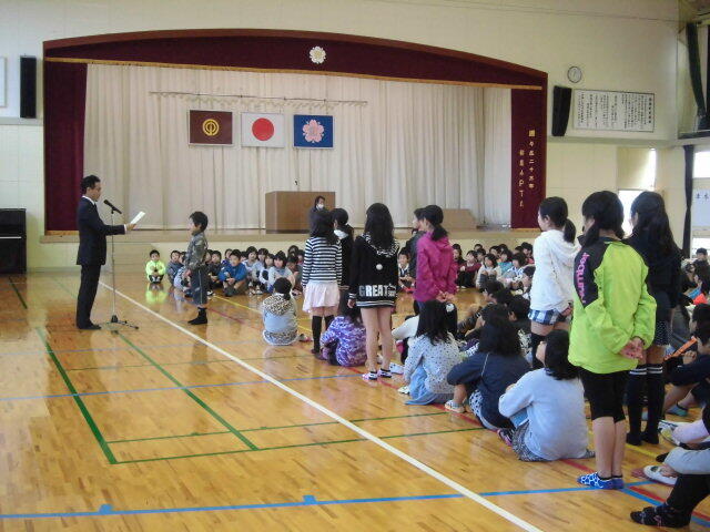 次に、2年生代表児童(2名)が2学期がんばったこと、3学期にがんばりたいことについて作文発表をしました。はっきりとした声で堂々と発表していました。最後に表彰が行われました。ここでは、スポーツ少年団や各種作品展などでがんばったたくさんの子どもたちが表彰されました。