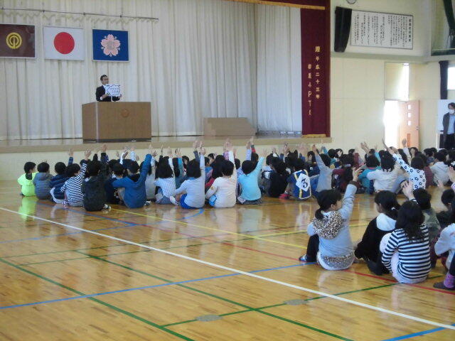 その後、1月目標で保健主事の先生より、かぜやインフルエンザの予防法について、話がありました。手洗い、うがい、マスク着用で欠席0を目指します。