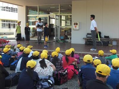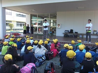 多くの保護者の方や先生たちが見守る中、都農小学校の玄関で出発式が行われました。校長先生や担任の先生から、この宿泊学習をとおして、頑張ってほしいこと、できるようになってほしいことなどのお話がありました。