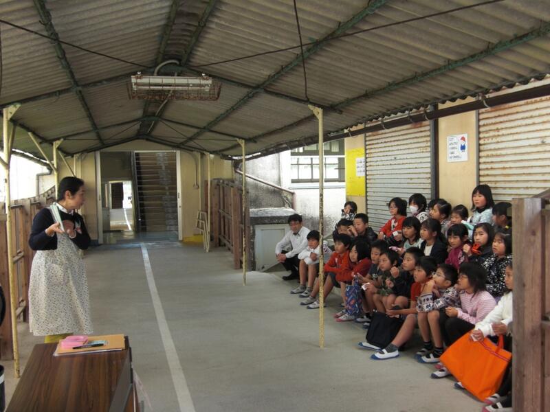 体育館の前には、今回もたくさんの本が並べられました。今回の移動図書館でも前回のように、本の貸出だけではなく、本の読み聞かせも行ってくださいました。4年生の子どもたちは、真剣に、そして時折笑いながら読み聞かせを楽しんでいました。