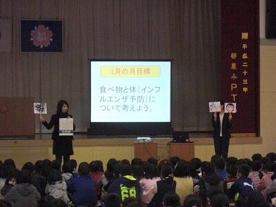 次に、保健室の先生から、インフルエンザにならないために、手洗いうがいをしっかりすること、マスクで鼻と口を覆うこと、換気をしっかりと行うことなどのお話がありました。規則正しい生活を意識してしっかりと予防を行い、インフルエンザにかからないようにしてほしいです。