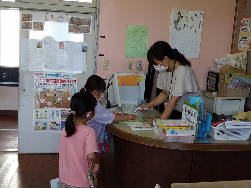 学校を陰で支えていただいている人紹介の第2弾です。毎週木曜に来校されている図書サポートの方です。都農町立学校を1日ずつ回られて、図書室のいろいろな整備をしていただいています。今日は1年生が図書室を利用していたので、貸出処理などをされていました。普段何気なく利用している図書室、よく見てみると心の友達となる本が見つかるかもしれませんよ。