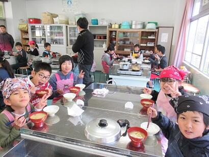 12月12日(水)に5年2組が、12月19日(水)に5年1組が調理実習を行いました。今回は、『ごはんとみそ汁』を作りました。お米は、5年生の子どもたちが、農家の方やJAの方々に協力していただきながら、丹精込めて作ったお米を使いました。鍋でお米を炊くことが初めての子どもも多く、火加減やお米の動きに注意しながら炊いていきました。