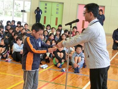 全校集団下校には参加できなかったので、全校朝会で表彰しました。