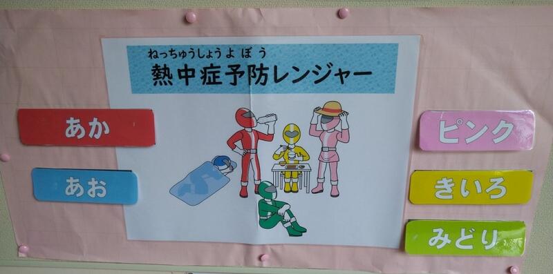 今日も朝から、太陽が降り注ぐ中での登校。でも多くの人から「おはようございます」の元気なあいさつが…。天気も蒸しあついですが、子どもたちの心はそれ以上にあつい!? 今日は水曜校時だったので昼休み時間は無かったのですが、時間があっても教室で活動することになったと思います。今図書室前の廊下に「熱中症予防レンジャー」という掲示物があります。ふと気になって5つの色を考えてみました。みなさん、わかりますか? この5つのレンジャーで熱中症にかからない予防をしましょう! 答えは写真の下にあります。