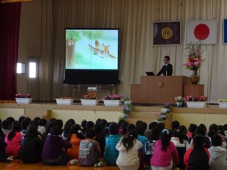 その後の校長先生のお話では、友だちのいなかったモモンガくんにたくさんの友だちができるお話の読み聞かせを通して、子どもたちにエールが送られました。