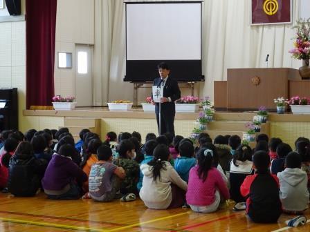 修了式後には、生徒指導主事の先生から、春休みの過ごし方についてお話がありました。「水」、「人」、「火」、「車」、「金」の5つの中でも、特に春休みは、「車」と「水」に気を付けるように言われました。事故やけががなく楽しい春休みにするために大切なことです。子どもたちは、尋ねられると積極的に答え、きちんと分かっているということを伝えようとしていました。