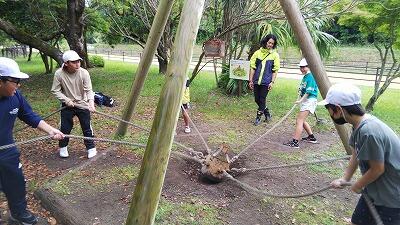 子どもたちが最も楽しみにしていたフィールドアスレチックが行われているようです。笑う