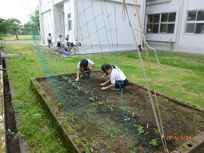 【朝、ヒョウタン、ヘチマ、ゴーヤのお世話をする4年生】