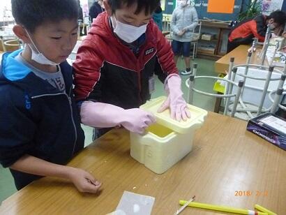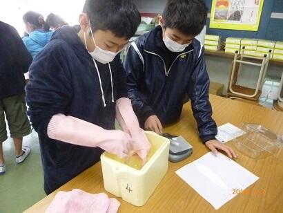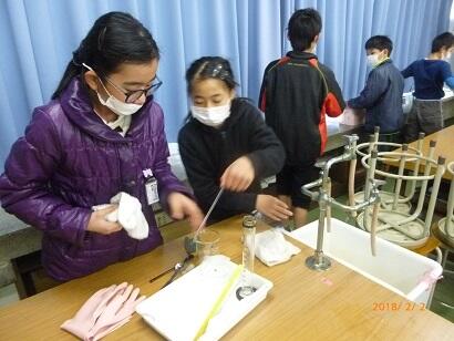 「ミョウバンは、温度を上げるとたくさん溶けるが、食塩はあまりとけない」ということに5年生はビックリしていました。