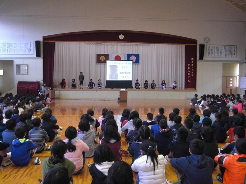 12月8日(木)、人権集会が行われました。放送委員会の児童が、7月、10月の「ふわふわ月間」に全校児童で取り組んだ「ふわふわ言葉の木」に貼られた「ふわふわ言葉」をもとに、発表を行いました。