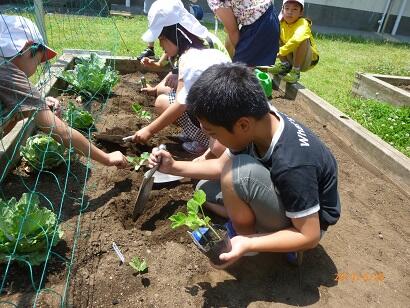 種子から育ててきたヘチマやヒョウタンを花壇に植えかえる作業をしました。