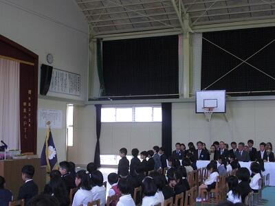 式が始まると、音楽に合わせて、元気よく1年生の子どもたちが入場してきました。担任の先生から新入生一人一人の名前が呼ばれると、たくさんの来賓の方々や保護者の方々、5・6年生や職員の見守る中で、元気よく「はいっ!」と大きな返事をして立つことができました。来賓の方々や校長先生からたくさんのお祝いの言葉をいただきました。また、6年生からは、都農小学校の様々な行事や楽しいことの発表があり、1年生の子どもたちは今日から始まる小学校生活をとても楽しみにしている様子でした。