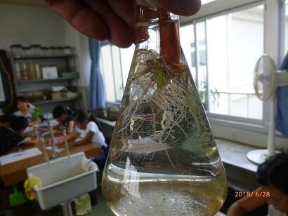隠しておいた三角フラスコに入れた根を見せると、「すご~い」「きれ~い」という大きな感動の声が上がりました。