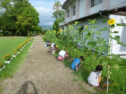 「理科は感動だ!①」で紹介した時は20cm程度だったヒマワリも、成長に適した気象条件と子どもたちの愛情によって、順調に成長してきました。