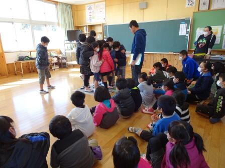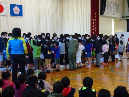 3月2日(木)、お別れ遠足がありました。まず、朝の時間にお別れ集会がありました。卒業式に参加しない1~3年生が、6年生にお礼やお祝いの言葉を呼びかけ、歌を歌ったり、プレゼントを渡したりして、6年生の卒業を祝いました。4年生と5年生からも歌のプレゼントがありました。最後に、6年生が全校児童に向けてすてきな歌声を届けてくれ、素晴らしいお別れ集会となりました。