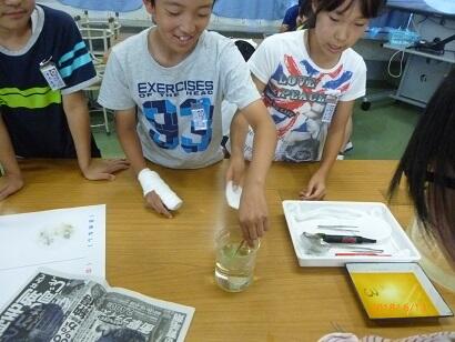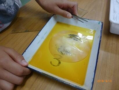 日光に当てた葉をヨウ素液につけた時、すぐに青紫に染まった様子を見て、驚きの声を上げていた6年生です。