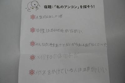 「団長は男子」「男子は青が好き」「女性は髪の毛が長い・・」「眼鏡をかけている人は頭がいい・・」「メイクをするのは女子だ・・」etc