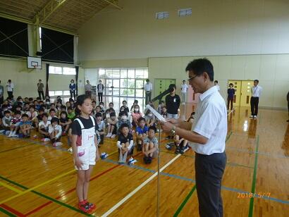 最後に、表彰が行われました。柔道で4年生の『石本夢乃さん』、陸上で4年生の『三輪樹里さん』、『河村竜弥さん』、6年生の『陶山元気さん』、ピアノで3年生の『荒川絢音さん』が銅賞で表彰されました。おめでとうございます!今後のますますの活躍を期待しています!