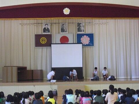 体育館(後半に、6年生が三先生慰霊碑にいき献花を行います。)
