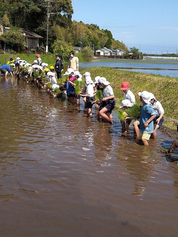13日(火)、田植えをしました。昼まで降っていた雨も上がり、田植えには絶好のコンディション。土地の持ち主の方やJA青年部の方々にご支援いただき、5年生2クラスで約1時間取り組みました。こういう体験ができること自体、とても恵まれていると思います。食のありがたさを実感しながら、収穫を楽しみにしながらとても有意義な時間を過ごすことができました。ありがとうございました。